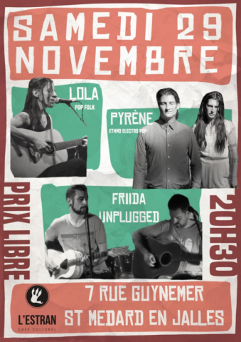 le samedi 29 novembre à 20h30 : PYRENE accompagné de LOLA et de FRIIDA UNPLUGGED :